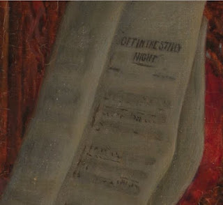 Por último, la partitura que está situada en el piano nos da la clave del elemento que ha hecho reaccionar la moral de la joven: la música. Ambos amantes estaban tocando el piano, y la letra de la partitura del piano, que se corresponde a la canción Oft in the Stilly Night de Thomas Moore. Esta canción habla del pasado y de la melancolía, y probablemente esta letra es la que ha despertado la conciencia de la protagonista. La canción dice así: