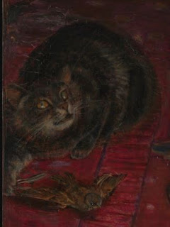 La parte inferior de la composición es un caos: vemos un guante sucio, que alude al probable destino de la joven, vemos también que la alfombra se está deshilachando, esto puede ser una referencia a aquello que se sale de su camino, a la mujer saliéndose del camino correcto al igual que el hilo se ha salido del patrón textil. Aparece también un gato cazando a un pájaro, y mirando directamente a la pareja protagonista, como indicando que del mismo modo que él ha cazado al pájaro, el hombre la ha cazado a ella.